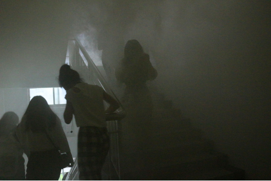 为使同学们更好地运用所学消防理论知识,学院使用了无毒的烟雾弹模拟火灾中的浓烟,组织同学们进行了一场逃生演练。在呛鼻的浓烟中,同学们按要求有序逃离现场,顺利完成演练。