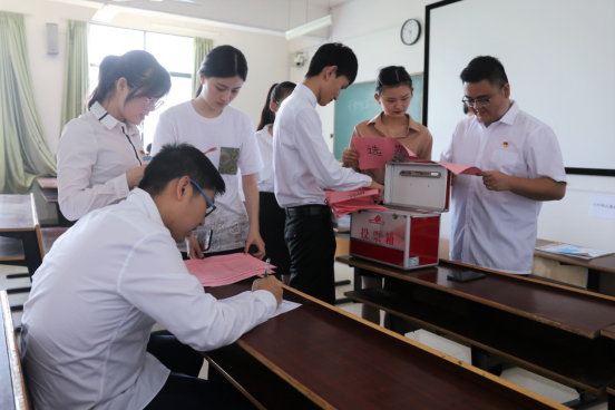 大会本着民主、公开、公正的原则,采用无记名投票的方式选举产生新一届分团委学生会主席团成员,团学代表们遵循民主自愿原则投出自己的选票。何颖副书记公布选举结果,并宣告由蔡玉琴等7位同学组成的第19届分团委学生会主席团正式成立,希望她们能协助学校、学院领导老师,带领新一届分团委学生会干部们圆满完成各项工作。