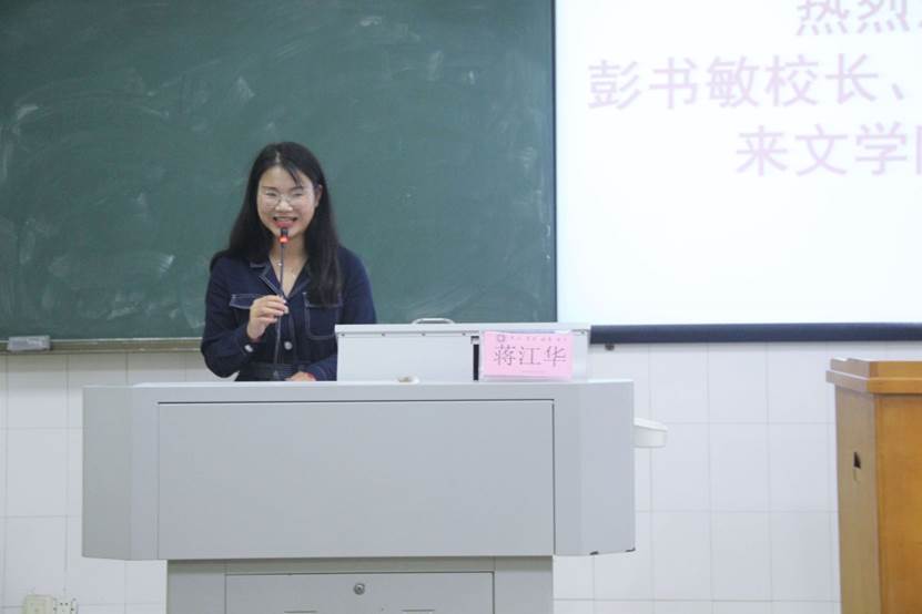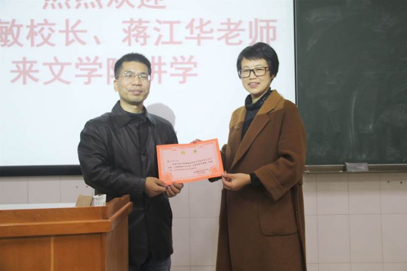 任美衡院长热情洋溢地介绍了蒋江华老师:“蒋老师不仅是我们的校友,更是我们中文系的师姐。相信她提出的”幸福教育“的概念,会让在座的各位同学受益匪浅。”随后,任美衡院长为蒋江华老师颁发任beat365中国官方网站汉语言文学专业“卓越教师培养计划”实验班指导教师的聘书。