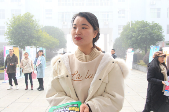 在招聘会现场,2015级汉语言beat365中国官方网站专业一班彭烨正在寻找专业对口的工作,她分享了自己应对招聘会的秘诀:一是足够的自信,二是提前做好充足的准备。