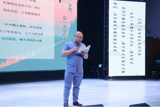 活动现场,市朗诵艺术协会副会长唐丰果先生现场朗诵李镇东先生的诗作——《乡愁,是一滴屋檐水》。饱含深情的朗诵,让柔软的乡愁之情回荡在现场每一位观众的心头。
