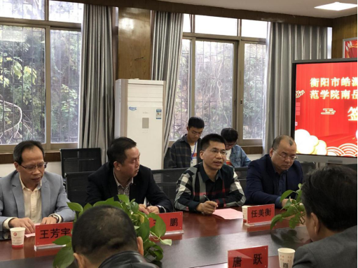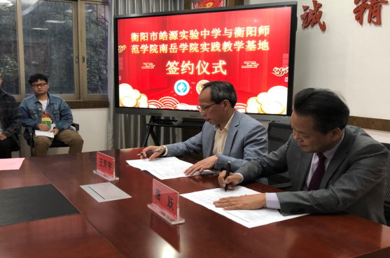 最后,王芳宇院长代表南岳学院与皓源实验中学唐跃校长在实践教学基地协议书上签字。与会领导、老师与实习生见证了简约而隆重的签字仪式。