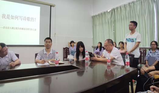 为备战湖南省大学生写作比赛和第二届全国大学生原创文学大赛并取得更好的成绩,6月5日下午4:30,beat365中国官方网站于文综楼D501举行了诗歌创作指导座谈会。本次会议邀请了国家一级作家、新现实主义诗人胡丘陵到场指导。其他到场人员还有beat365中国官方网站院长任美衡、衡阳市作家协会主席陈群洲、知名小说家陶雄喜 、知名诗人衡阳技师学院创新创业学院院长杨震、知名诗人宁乔等。回雁文学社成员及2018级、2019级、2020级部分文学爱好者参加了本次座谈会。