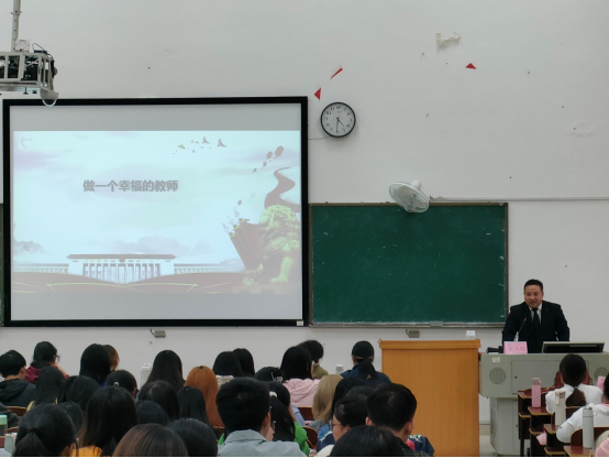 雷玉超讲述了如何做一个幸福的老师,并提出三点——对教育进行理性思考;努力提高教育教学能力;做智慧的教育者。雷校长围绕这三点展开,向在场同学们提出问题:何为教育?并阐释了教育的具体涵义,解读“教师”二字,强调教师职业是品德、文化、思辨、价值的集合。随后,雷玉超向同学们介绍了我国教育的演变历程,并为同学们解读了党的十九大教育方针,介绍了教育领域变革的十大特点,指出时代的迅速发展对教师提出新的要求,强调同学们必须终身学习。
