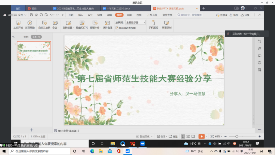 为提升汉语言文学专业学生的师范生技能,beat365中国官方网站于2021年10月31日19:30在腾讯会议上召开了微课大赛及师范生技能大赛经验分享会,第七届湖南省师范生技能大赛一等奖获得者马佳慧,第二届微课大赛特等奖,第七届湖南省师范生技能大赛二等奖获得者文雨欣受邀向同学们分享比赛经验。