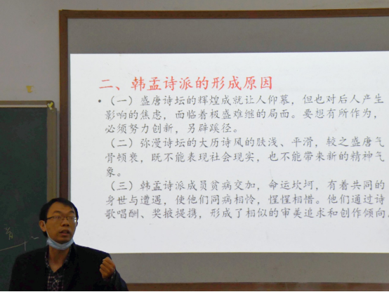 在西校区行知楼110,吴戬老师面向21级汉四、汉六班全体同学开展了一堂中国古代文学课。吴戬老师的课堂生动活泼,激情四射。基于老师广阔的知识面,课堂的文学性、专业性十足。与此同时,吴戬老师风趣幽默,用诙谐的语言将古代诗人的形象带到学生面前。相信从吴老师的课堂上,同学们都受益匪浅。